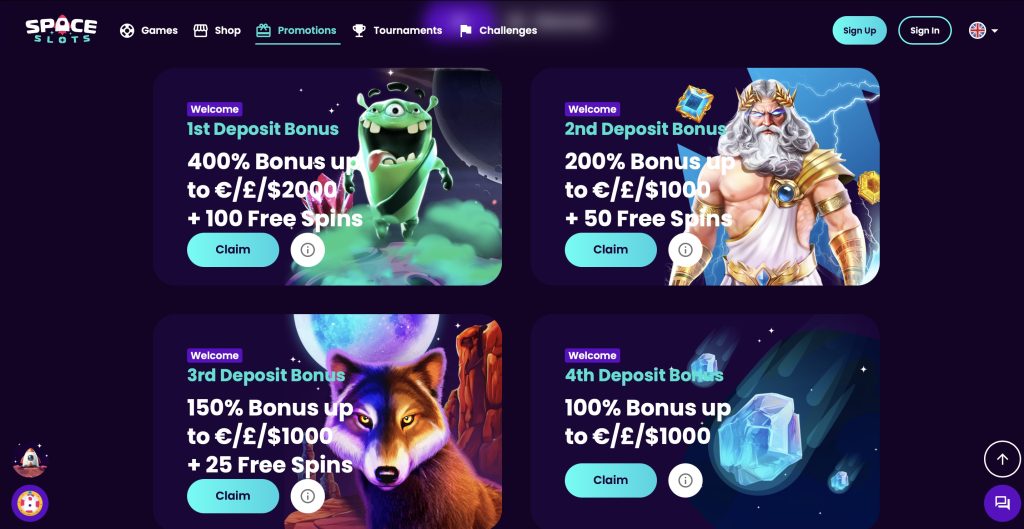 Space Slots casino has a huge variety of bonuses and ongoing promotion to reward new and returning players, they include: